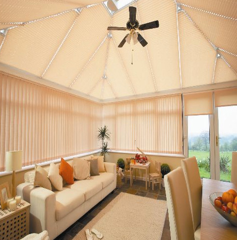 Louvres are normally weighted at the bottom and connected to each other by chains that are fitted near the bottom of the louvres. Louvres can include an enclosed bottom weight that does not feature stabilising chains. A third option features a bottom rail with controls operating both headrail and bottom rail. Blinds made in this way can be fitted at an angle and are suitable for skylights. Louvres can be made in a variety of materials. Woven, knitted or non-woven fabrics are used as the base to which specialist coatings are applied to endow the fabric with additional performance features. Such features include finishes such as solar protective coatings for improved solar and optical performance and flame retardant coatings. Totally opaque fabrics are available in a variety of substrates for blackout purposes. They are also available in washable fabrics. Although such fabrics can be completely opaque it should be noted that vertical blinds only offer a dim out option.